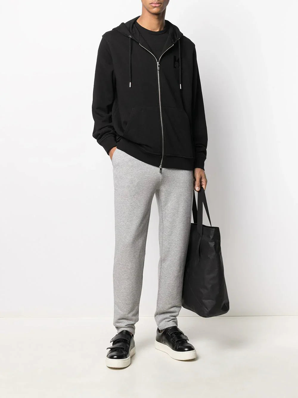 black cotton-blend drawstring hood long sleeves ribbed cuffs two side slit pockets ribbed hem